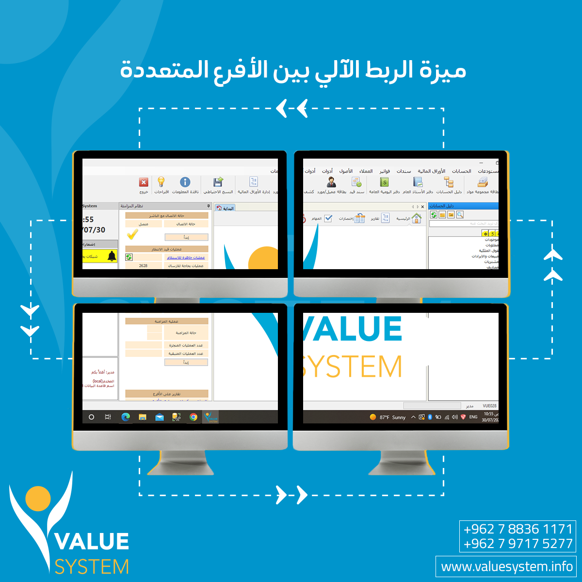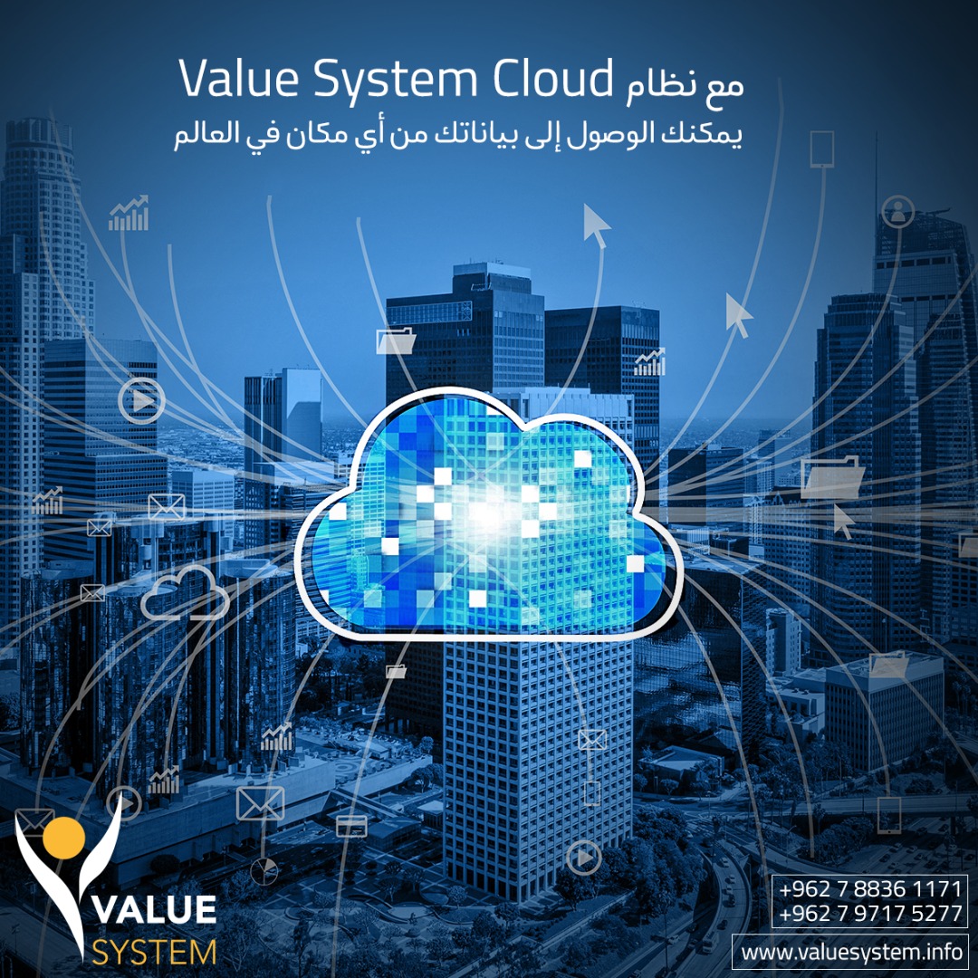 لم يعد موقع العمل عائقاً أمام توفر جميع بياناتك المحاسبية والمالية على التخزين السحابي ، فيمكنك الوصول للملفات والمستندات من أي مكان بالعالم عن طريق الاتصال بالانترنت تمتمع بالمزيد من المزايا مع برنامج Value System